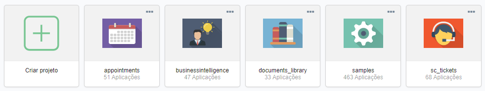 Exibição padrão ao acessa o Scriptcase pela primeira vez, exibe os projetos em cards com algumas informações básicas.