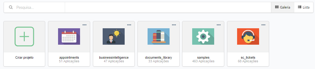 Esta é a tela inicial do Scriptcase, exibida logo após o login. Ela exibe os projetos criados na ferramenta ao qual o usuário tem acesso, estes projetos são exibidos no formato de Galeria(visualização padrão).