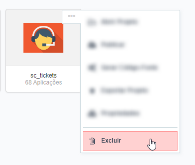 O projeto pode ser deletado através do Menu flutuante disponível na interface dos projetos. Clique aqui para mais detalhes do menu.