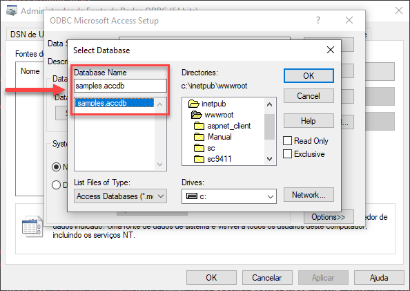 Informe o caminho completo até o arquivo de banco de dados Access.