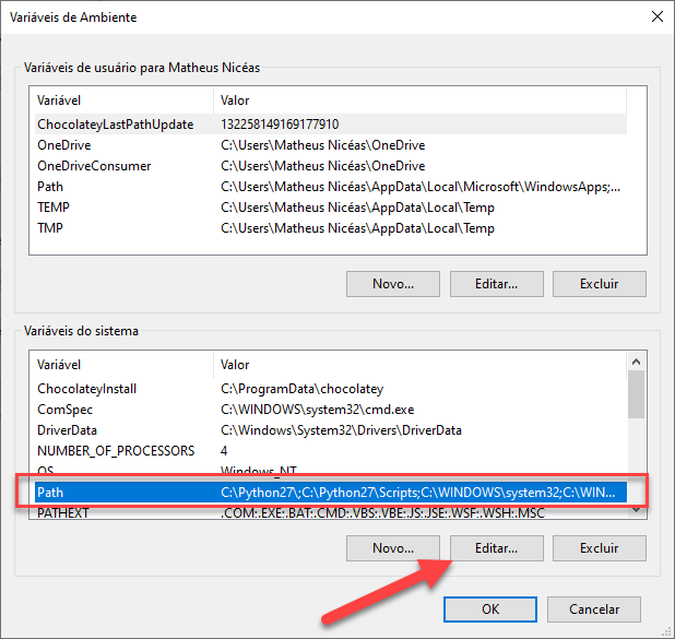 - Em Variáveis do sistema, Selecione o item Path e clique em Editar.