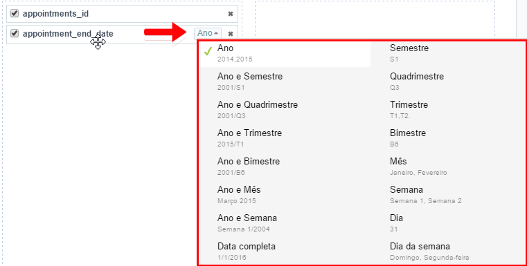 O desenvolvedor pode escolher mais de um campo como uma dimensão e para campos do tipo data e hora poderá escolher sua formatação, cada novo campo como uma subcategoria do campo anterior.