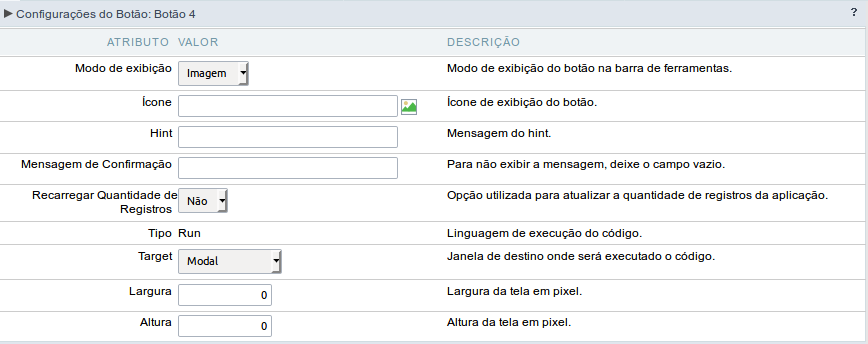 | Target | Permite definir a jenal de destino onde será executado o código ( Mesma janela, Outra janela, Modal) |