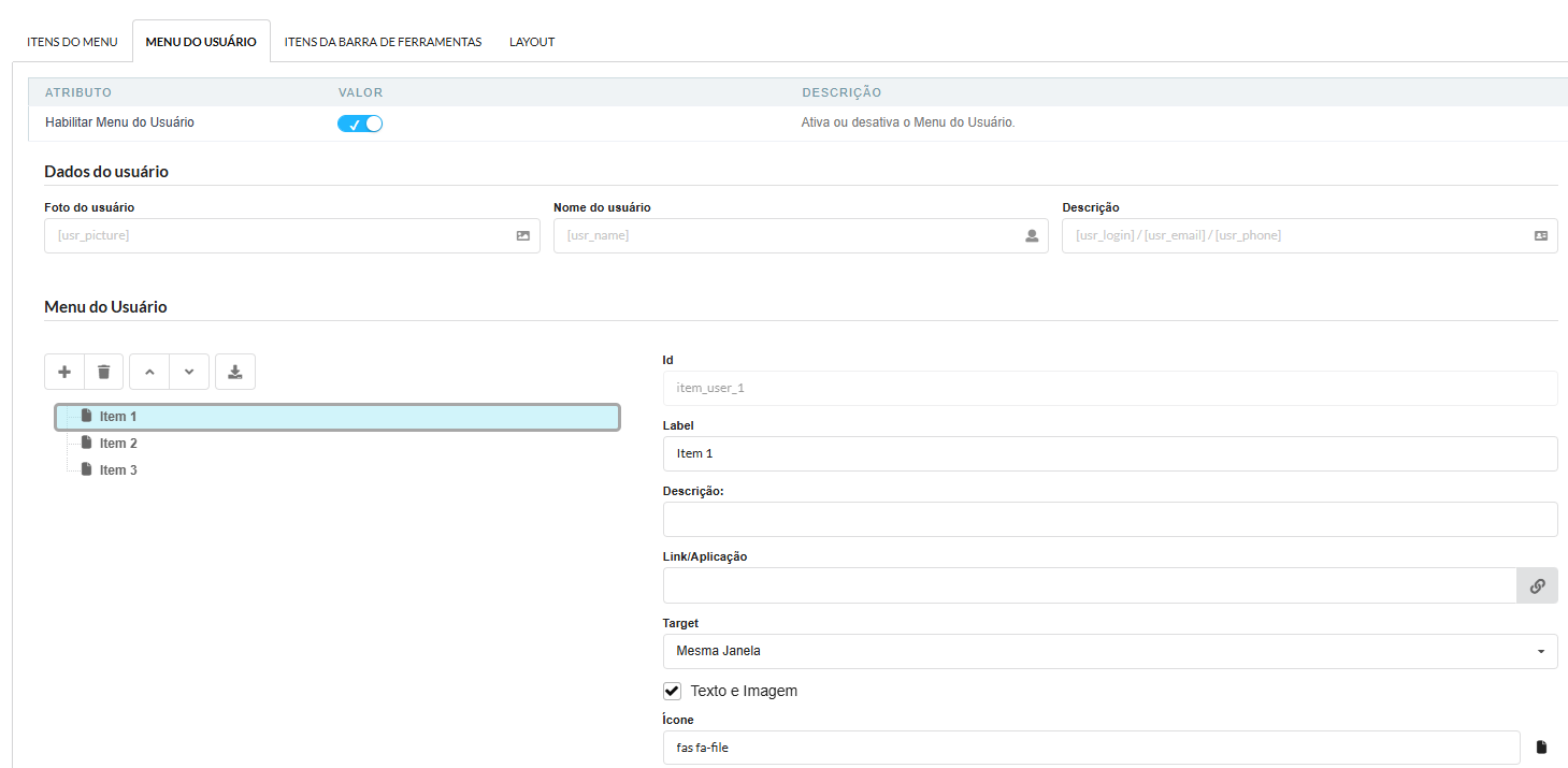 Essas configurações dizem respeito aos itens que serão exibidos ao clicar no ícone do usuário do menu.