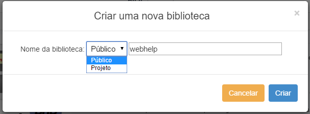Para criar uma biblioteca, clique em Criar uma nova biblioteca. Em seguida, informe um nome para esta biblioteca e selecione o nível de acesso a biblioteca.