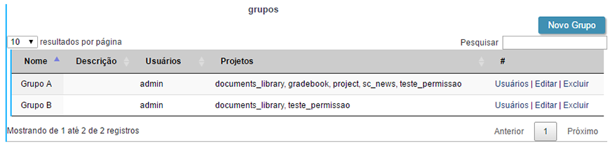 Gerenciamento dos grupos de usuários. Ao acessar teremos uma lista dos grupos existentes com algumas informações pertinentes.