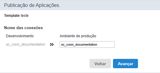 Nesta opção informaremos os nomes das conexões existentes em seu projeto para implantação.