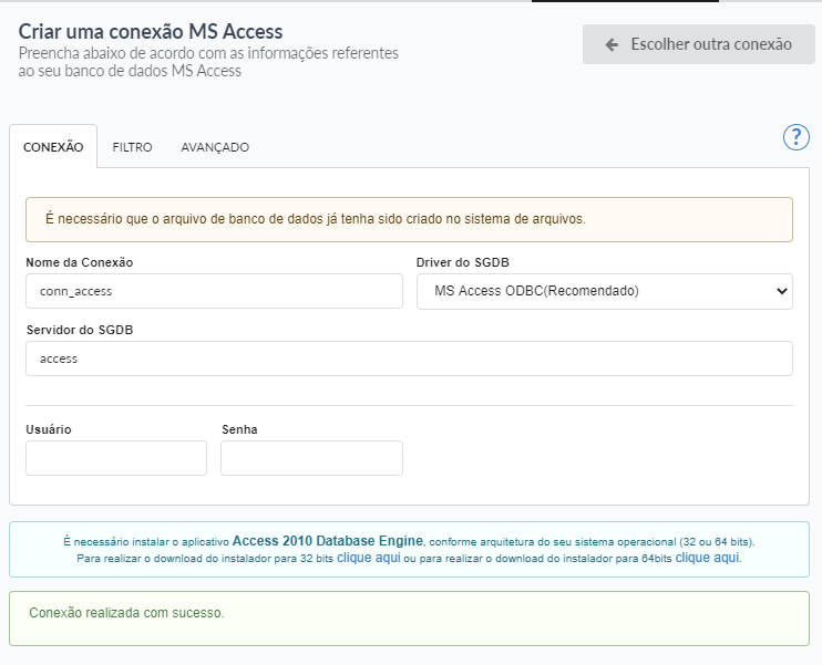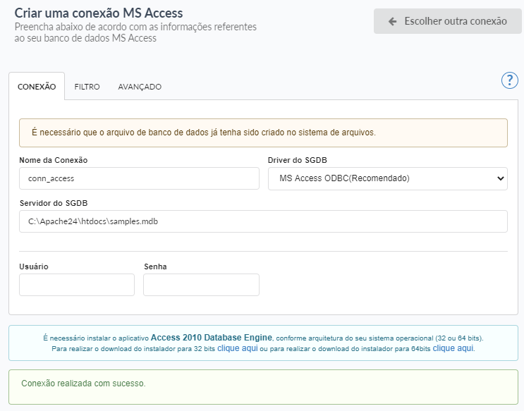 Informe o caminho completo até o arquivo de banco de dados Access.