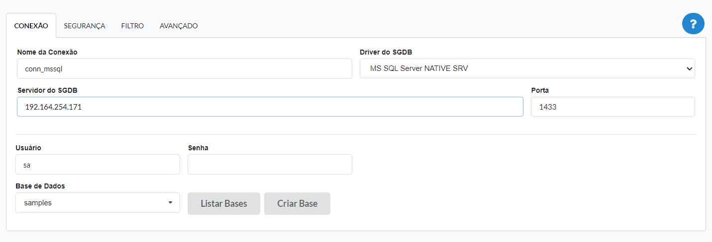 Informe os parâmetros para conexão ao seu banco de dados MSSQL Server da seguinte forma: