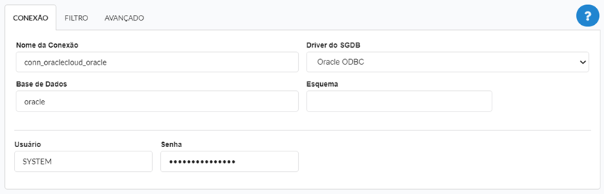 - Usuário: Informe o usuário para autenticar a conexão com o seu banco de dados Oracle.