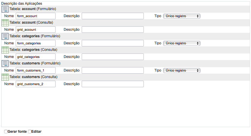 - Tipo - Opção disponível apenas para os formulários, define o tipo de formulário que será criado (Único Registro, Múltiplos Registros, Grid Editável ou Grid Editável View)