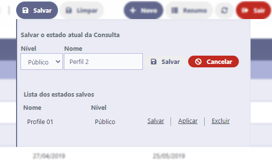 Salvar Consulta - Salva o estado atual da consulta em um perfil criado no momento do salvamento. Permitindo que mais de um layout seja salvo.