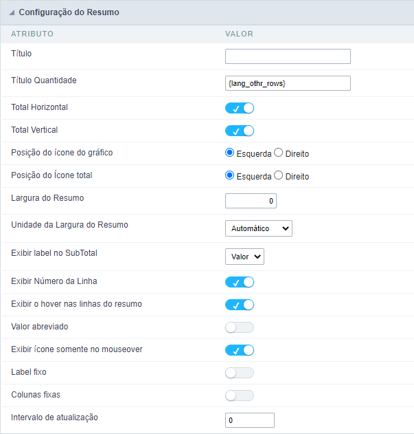 - Unidade da Largura do Resumo: Unidade de medida usado para a largura. Automático (valor da largura é ignorado), pixels e porcentagem.