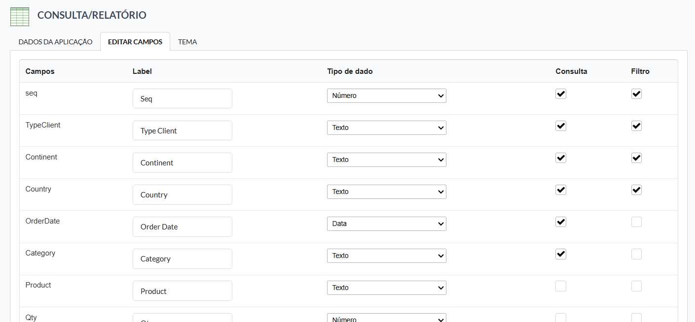 Esta tela exibe os campos das tabelas selecionadas e permite realizar ajustes antes da criação da aplicação, como alteração do tipo de dado, nome de exibição e outras configurações.