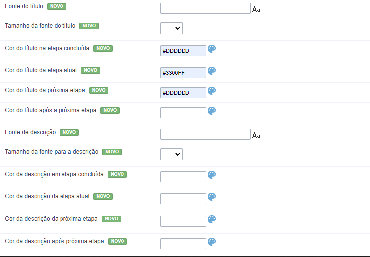 Fonte de descrição Define a fonte para a descrição da etapa. Caso não seja informado, será aplicada a mesma fonte definida no tema do aplicativo.