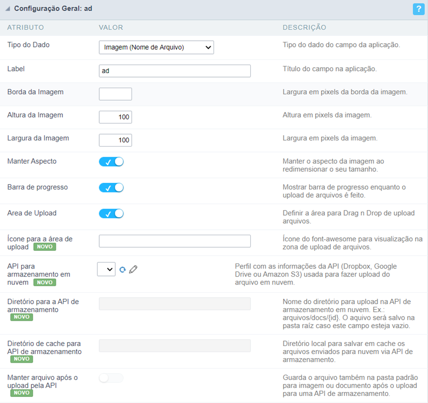 - Diretório para a API de armazenamento : Nome do diretório para upload na API de armazenamento em nuvem. Ex.: arquivos/docs/{id}. O aquivo será salvo na pasta raíz caso este campo esteja vazio.