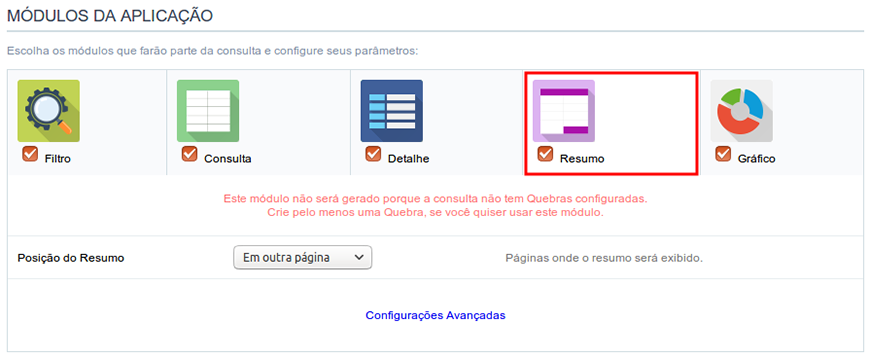 - Posição do Resumo : Define o modo de exibição do resumo ( Em outra página, Na última página, Em todas as páginas ). O resumo só será exibido quando uma Quebra for criada.