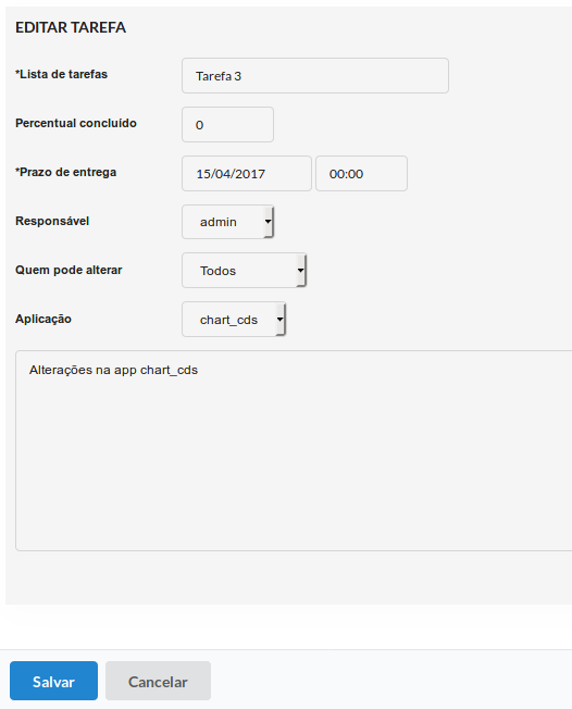 - Aplicação - Informe a aplicação do projeto que o responsável deve editar. (Esta opção está disponível apenas para tarefas criadas dentro de um projeto.)