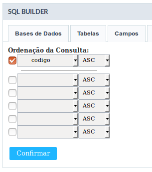 Selecione os campos que devem fazer parte da consulta. Os campos podem ser ordenados alfabeticamente (Ascendente) ou na ordem em que foram criados (Padrão)