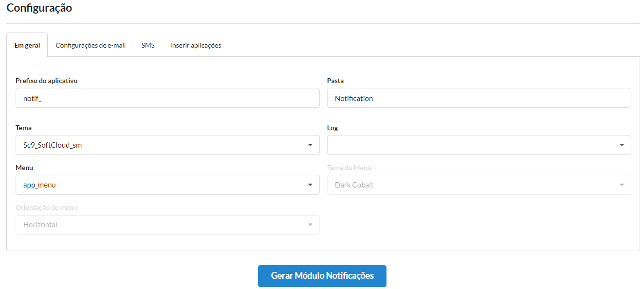 Nesta etapa será disponibilizada Configurações Gerais, Email, SMS e Inserir Aplicações