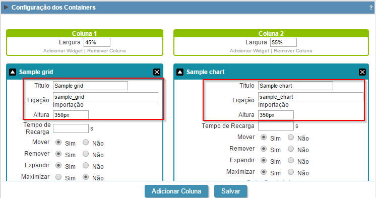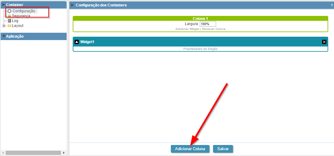 Aplicação de container Neste exemplo será criado uma aplicação de container mostrando resumo e gráfico em cada widget. Criando um novo Container 1. Crie uma nova aplicação do tipo Container. 2. No menu da aplicação abra a pasta Container >> Configuração e clique em Adicionar Coluna.