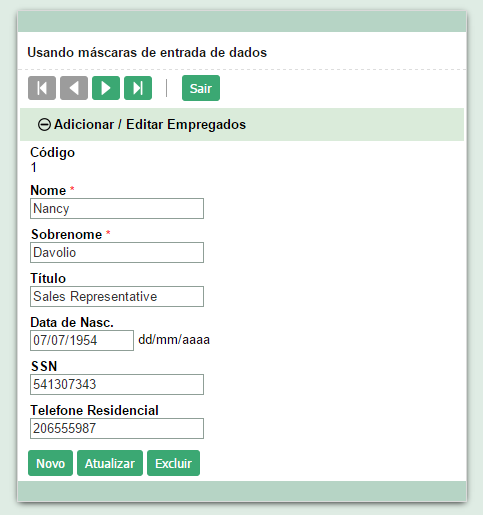 Usando mascaras em Entrada de dados Neste exemplo será desenvolvido um formulário utilizando máscaras de entrada personalizadas e rotina para validação de social security number usando ajax.