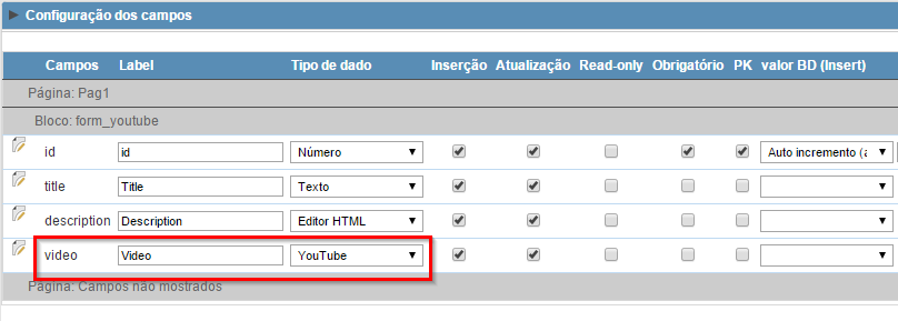 3. Selecione "youtube" para o tipode dado do campo "video". Utilize as configurações dos outros campos de acordo com a imagem baixo: