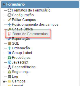 Criando o Formulário 1. Crie uma nova aplicação do tipo Formulário "Grid Editável (View)" baseado na tabela project. 2. Acesse o item "Barra de Ferramentas" no menu da aplicação