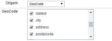 Campo Google Maps Existem 3 tipos de configurações disponíveis para o campo Google Maps, neste exemplo iremos utilizar o GeoCode. 1. Selecione GeoCode na opção Origem.(Método de passagem de parâmetros para a API do Google) 2. Em seguida, em GeoCode, selecione os campos que serão transformados em coordenadas geográficas para sua localização no mapa.