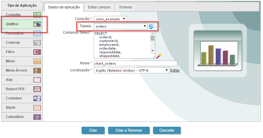 Criando as aplicações de Gráficos 1. Crie uma nova aplicação de Gráfico baseada na tabela orders adicionando ao SQL, a cláusula: WHERE orderdate BETWEEN '2008-01-01' AND '2008-06-30'.