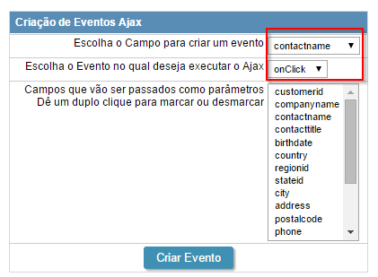 3. Selecionaremos o campo "contactname" e o evento 'onClick".