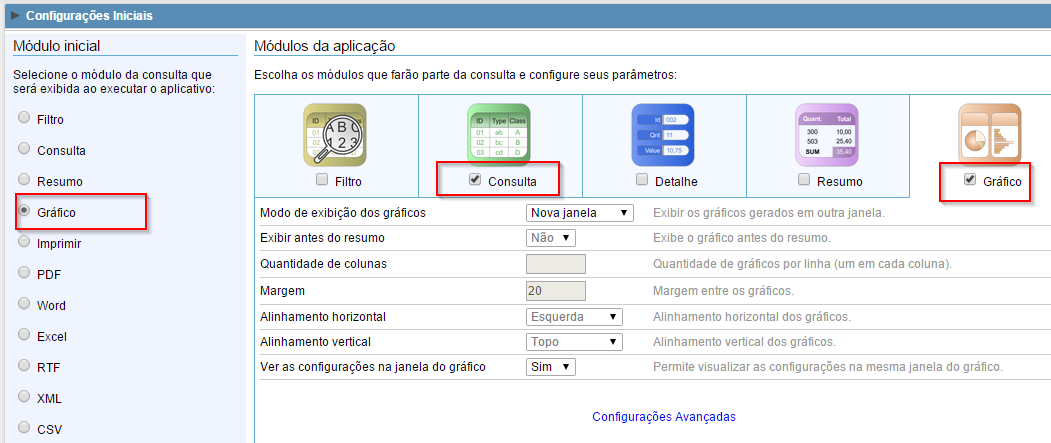 5. Marque o "Gráfico" como módulo inicial e deixe apenas os módulos "Consulta" e "Gráfico" habilitados.