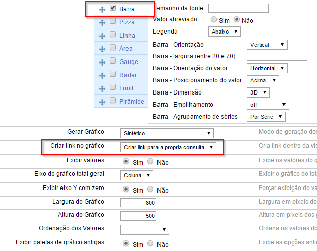 7. Na opção "Criar link no gráfico", altere para "Criar link para a própria Consulta". Utilize as demais configurações de gráfico, de acordo com a imagem abaixo ou de sua preferência.