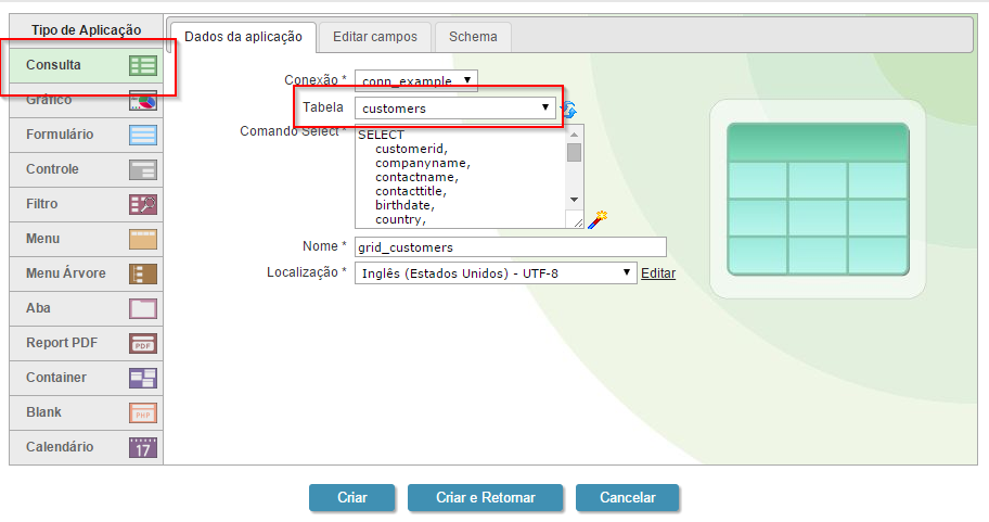 Criando a aplicação de Consulta 1. Crie uma nova aplicação de consulta baseada na tabela customers.
