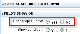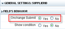11. Na guia de edição Field's Behavior marque a opção Onchange Submit. Esta opção fará com que no momento da seleção de um registro, o filtro seja executado automaticamente, fazendo assim, com que seja mostrado o resultado da consulta.